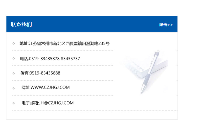 地址:常州市新北區友邦商務大廈1幢16、17層  電話:0519-85101652  傳真:0519-85112595  郵編:213022  網址:www.cz-jiayue_cn.jiangwei168.com  郵箱:xiajifengaa@163.com